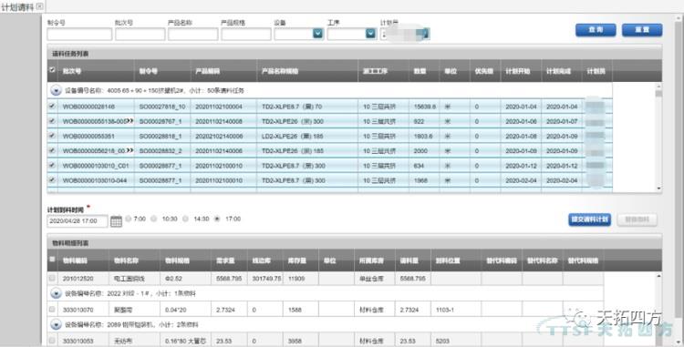 要實(shí)現(xiàn)此變革,需要為原材料倉(cāng)庫(kù)提供準(zhǔn)確的車間機(jī)臺(tái)物料需求信息。為此,天拓智能制造MES系統(tǒng)為原材料倉(cāng)庫(kù)提供了基于工單的車間物料需求數(shù)據(jù)。天拓智能制造MES系統(tǒng)根據(jù)工單、BOM材料定額、機(jī)臺(tái)接班材料數(shù)據(jù)自動(dòng)匯總出當(dāng)前班次機(jī)臺(tái)所需的物料種類和數(shù)量,經(jīng)過(guò)計(jì)劃員確認(rèn)后一鍵發(fā)送給庫(kù)房生成領(lǐng)料單。